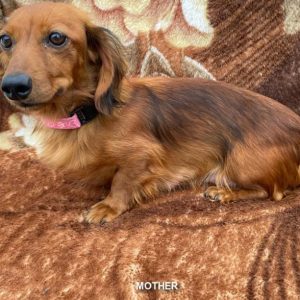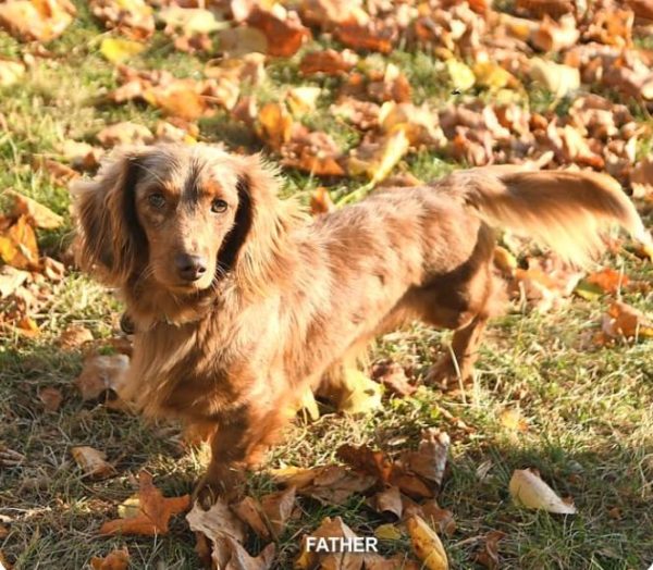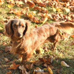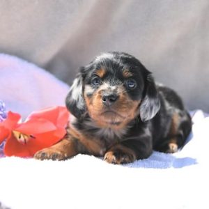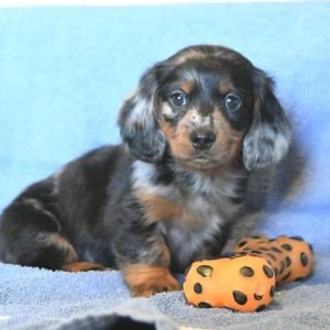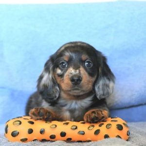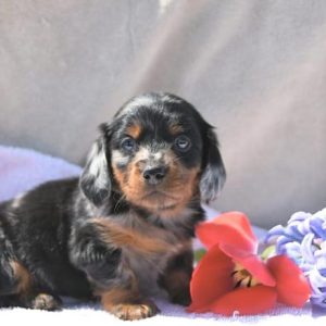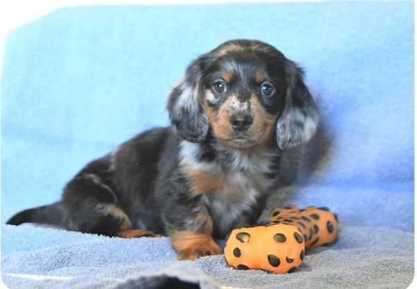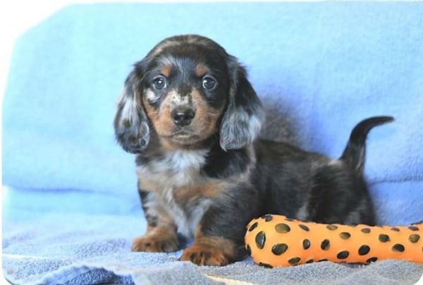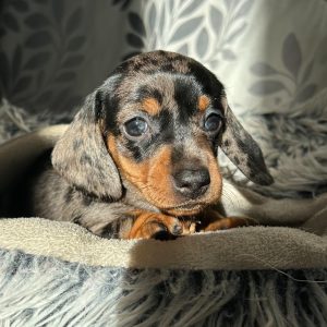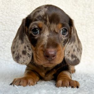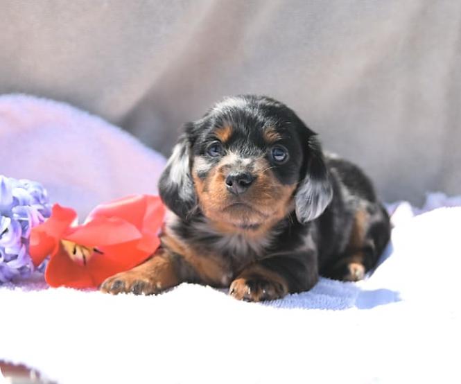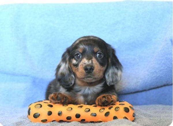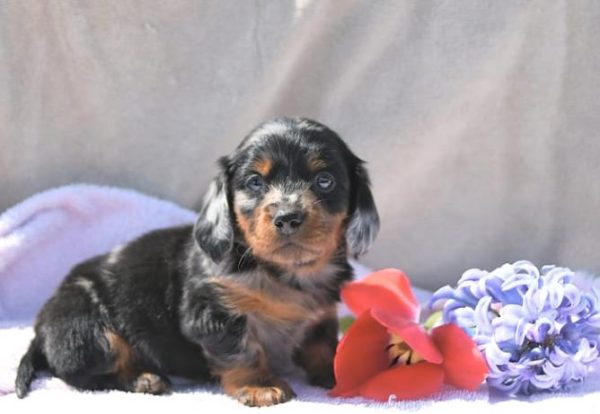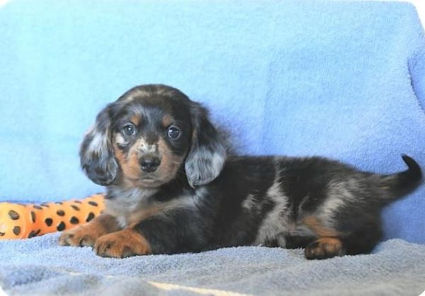 Meet Theodore, our adorable little AKC registered Mini Dachshund puppy with striking coloring, and a happy, friendly disposition. His mama weighs about ten pounds, and his dad is a striking chocolate dapple who weighs fourteen pounds. We are keeping this precious little pup up-to-date on shots and dewormer, and he will be litter-box trained when by the time he comes home with you. He receives lots of love and attention, so he is a well-socialized, adaptable puppy. If you are interested in adopting him, please send us a message for more information, and we will be happy to help you!